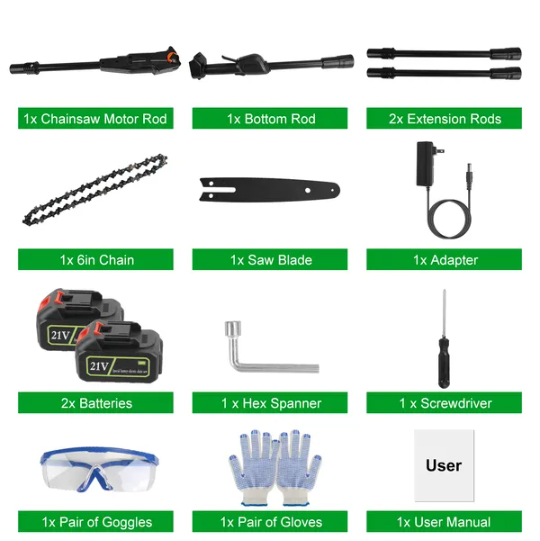 Assembled Chainsaw Size(With 2 Extension Rods& Battery): 12*8*226cm/4.72*3.15*88.9in